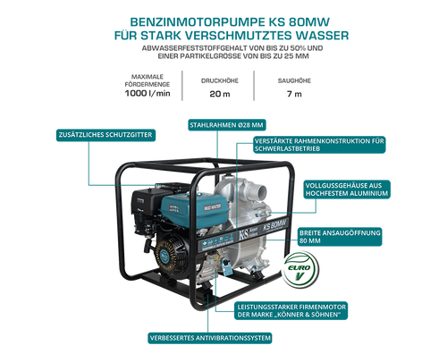 Las bombas de motor Könner & Söhnen® son bombas autónomas y de alto rendimiento para transferir agua limpia o muy contaminada en grandes volúmenes. Son fiables, potentes y ofrecen una altura de elevación de hasta 50 m. Adecuadas para diversas tareas, desde el riego de campos hasta la gestión de inundaciones o incendios.
