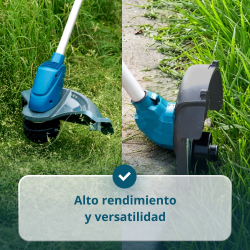 • Gracias al sistema de corte 2-en-1, el usuario puede trabajar tanto con hilo de nailon para un recorte preciso del césped como con cuchilla metálica para vegetación densa y maleza resistente.