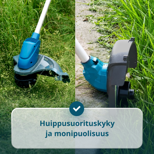 • 2-in-1-leikkuujärjestelmän ansiosta käyttäjä voi työskennellä sekä nailonlangalla tarkkaan nurmikon reunojen leikkaamiseen että metalliterällä tiheän kasvillisuuden ja sitkeiden rikkaruohojen käsittelyyn.