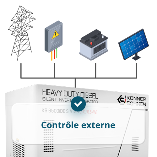 • Commande externe – permet de connecter des dispositifs de commande externes pour démarrer/arrêter le groupe électrogène  et l’intégrer à des systèmes automatiques via des contacts secs, tels que des onduleurs solaires, des systèmes UPS, etc.