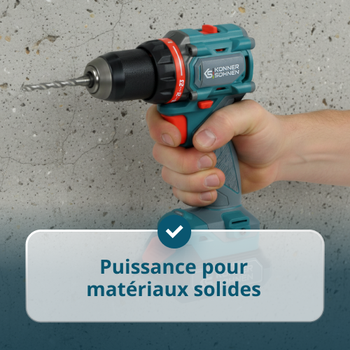 • Puissance pour les matériaux durs – la perceuse fournit un couple stable jusqu’à 60 Nm — suffisant pour travailler même avec des surfaces robustes — métal ou poutres en bois épaisses.