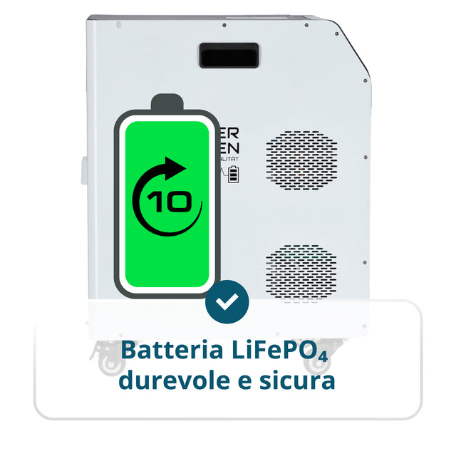 • Batteria LiFePO₄ durevole e sicura – durata fino a 6000 cicli e oltre 10 anni di servizio garantiscono un investimento affidabile nell'indipendenza energetica.