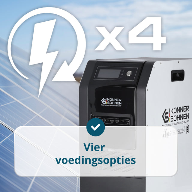 • Vier stroomvoorzieningsopties – netstroom, efficiënte zonne-oplading tot 80 % in 1 uur, DC-generatoren, extra batterijen, en direct schakelen daartussen indien nodig.