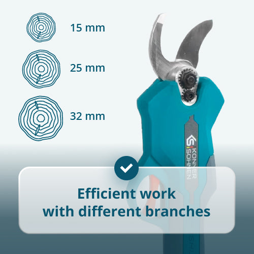 • Effizientes Arbeiten mit verschiedenen Zweigen – Drei Schnittweiten (15, 25, 32 mm) ermöglichen eine schnelle Anpassung an jede Zweigdicke, sparen Zeit und reduzieren den Energieverbrauch.