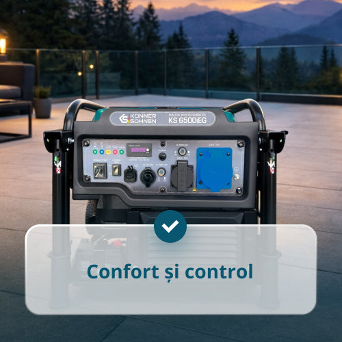 | Continut pachet | Generator, Instrucțiuni, Ambalaj, Husă pentru accesorii, Cheie pentru bujii, Șurubelniță PH2 6,0 mm, 2×Roți de transport, 2×Mâner de transport, 2×Piciorușe, Șlanț pentru conectarea la butelia de gaz, Reductor suplimentar pe șlanț, montabil pe butelie |