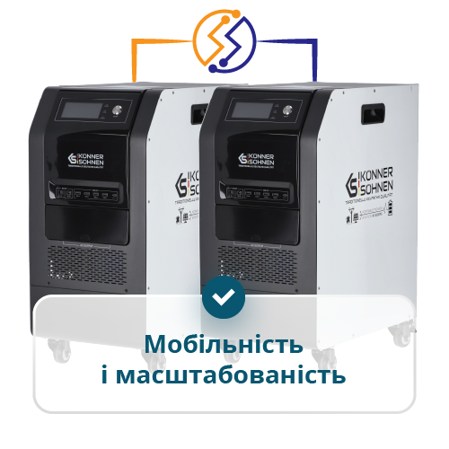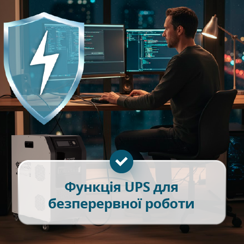 | Спеціальні функції | Вихід 48V DC для генератора або АКБ, Інвертор із “чистою” синусоїдою, LiFePO₄ 5,12 кВт⋅год, MPPT-контролер, UPS < 10 мс, Підтримка Tandem Power, Швидке заряджання до 80 % за 1 год, Захист від перевантаження та перегріву, РК-дисплей з моніторингом параметрів, Колеса та ручки для пересування |